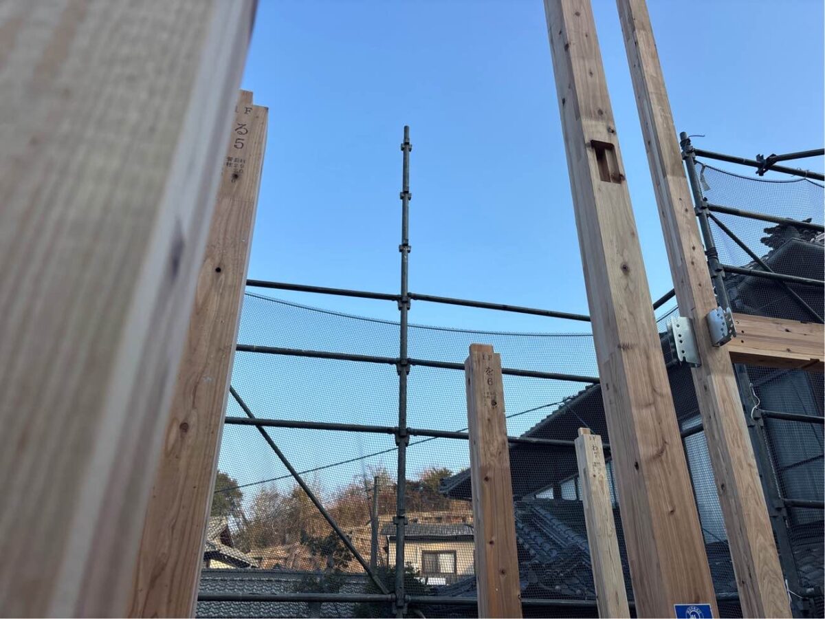 さげふりという道具を使い柱の垂直を確認します。