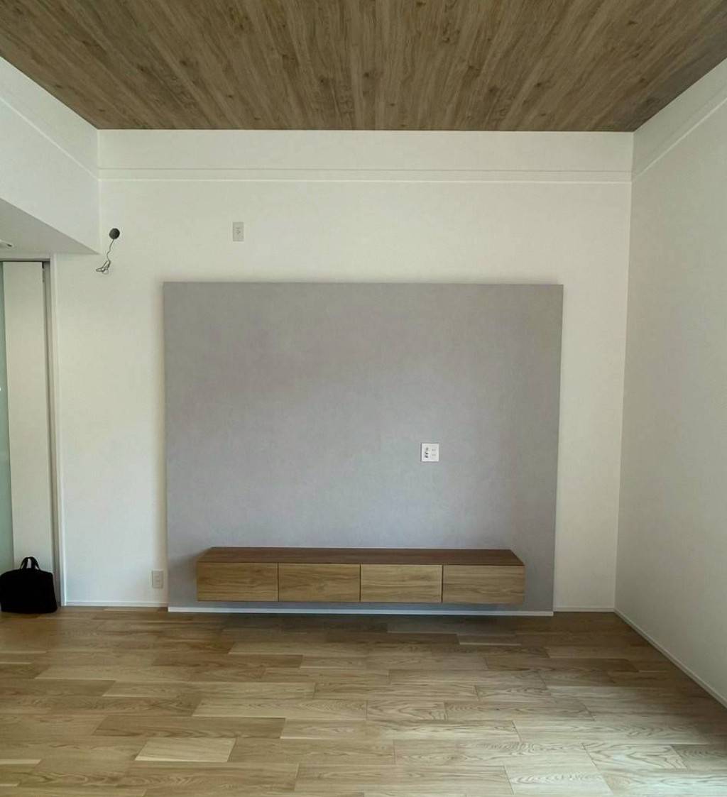 リビングはシンプルに整え、余白を大切にしたスッキリとした空間に。グレーのクロスとフロートのTVボードが空間のアクセントになっています。